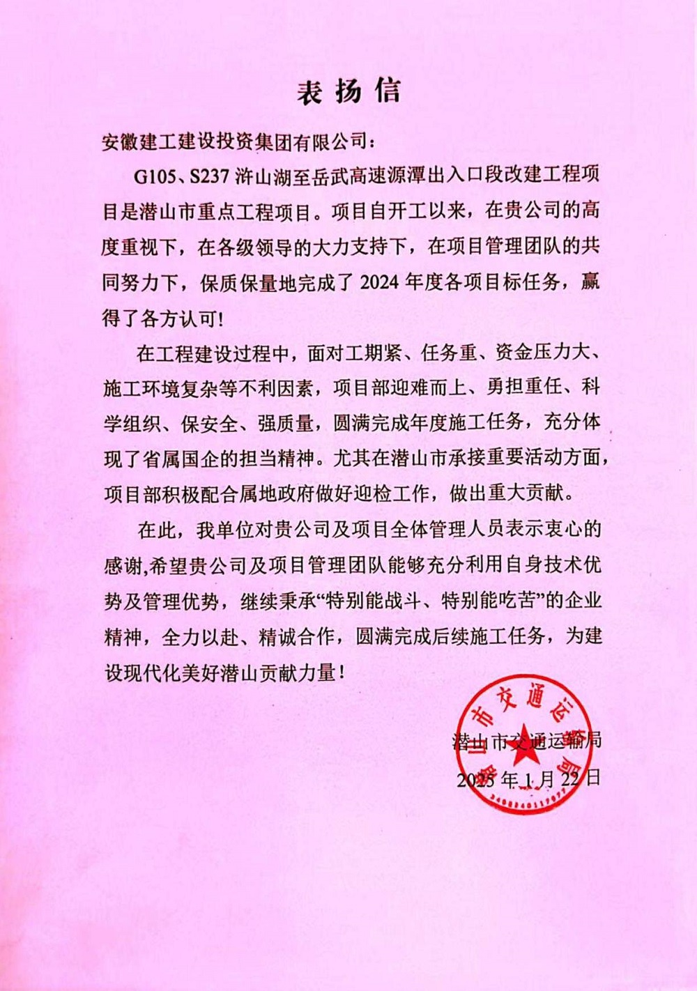 G105、S237滸山湖至岳武高速源潭出入口段改建工程業主單位潛山市交通運輸局來信表揚:項目部面對工期緊、任務重、資金壓力大、施工環境復雜等不利因素,項目部迎難而上、勇擔重任、科學組織、保安全、強質量,圓滿完成年度施工任務,充分體現了省屬國企的擔當精神。尤其在潛山市承接重要活動方面項目部積極配合屬地政府做好迎檢工作,做出重大貢獻。