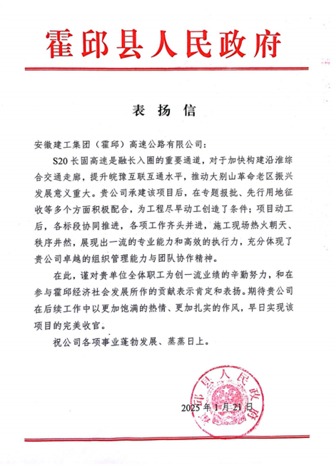 1月24日,建工投資S20長固高速霍邱至皖豫界段項目喜獲霍邱縣人民政府通報表揚,充分肯定了項目公司在前期工作推進方面取得的豐碩成果。