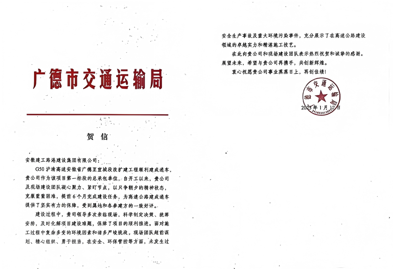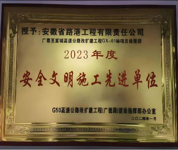 在項(xiàng)目建設(shè)的征程中,項(xiàng)目部一路奮楫篤行,斬獲多項(xiàng)殊榮,在多個(gè)領(lǐng)域取得了顯著成績(jī)。項(xiàng)目部多次獲得省質(zhì)安中心和業(yè)主、監(jiān)理單位的認(rèn)可表彰,獲業(yè)主單位“2023年度安全文明施工先進(jìn)單位”及環(huán)協(xié)“AAA級(jí)環(huán)保示范工地”稱號(hào),收到廣德市交通運(yùn)輸局賀信,受到屬地及各參建單位的一致好評(píng),并多次在公司項(xiàng)目“流動(dòng)紅黃旗”綜合評(píng)比中名列前茅。同時(shí),項(xiàng)目黨支部榮獲集團(tuán)2024年下半年“流動(dòng)紅旗”黨組織稱號(hào),項(xiàng)目9人獲得公司及業(yè)主單位榮譽(yù),這些成績(jī)見證了項(xiàng)目部全體人員的辛勤付出和突出表現(xiàn)。