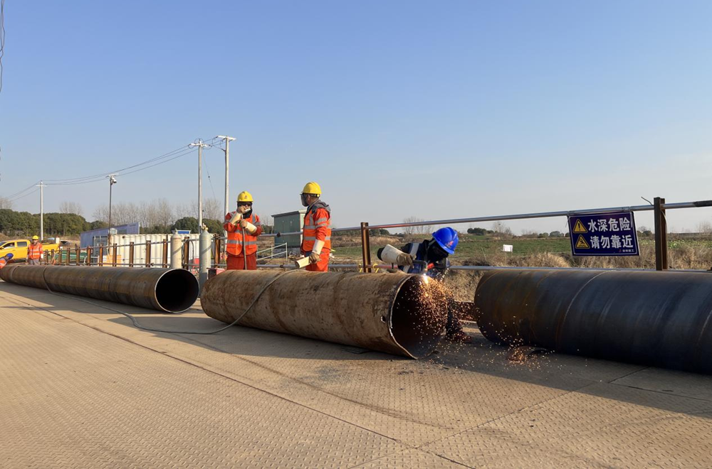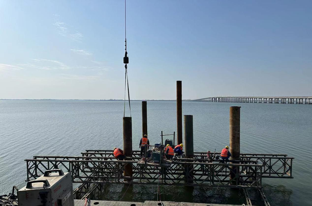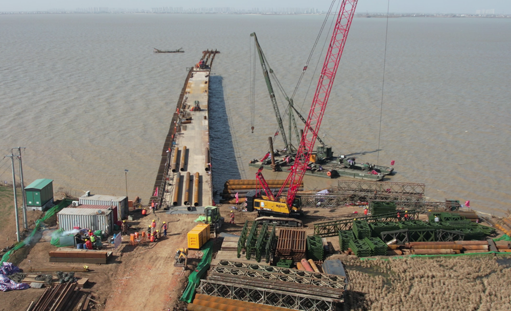 2 月 6 日,城東湖西岸拌合站鋼筋大棚基礎開挖、上料口模板拆除工作順利完成,鋼筋大棚材料進場;城東湖兩岸鋼棧橋橋面板鋪設穩步推進,鋼管樁打設有序開展,施工現場處處洋溢著奮進的活力。