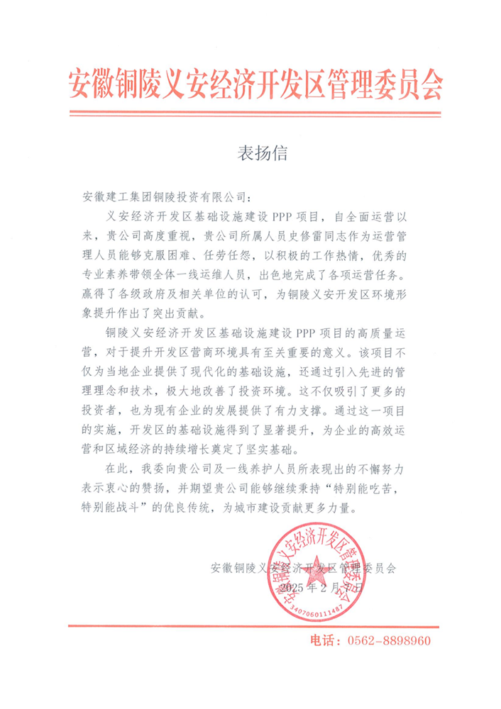 近期,建工投資銅陵PPP項目喜獲銅陵市義安經濟開發區管委會表揚。表揚信對項目運營團隊在運營期間的出色表現給予高度評價,項目公司彰顯的企業責任感、文化底蘊及良好形象獲得屬地政府和群眾高度認可。