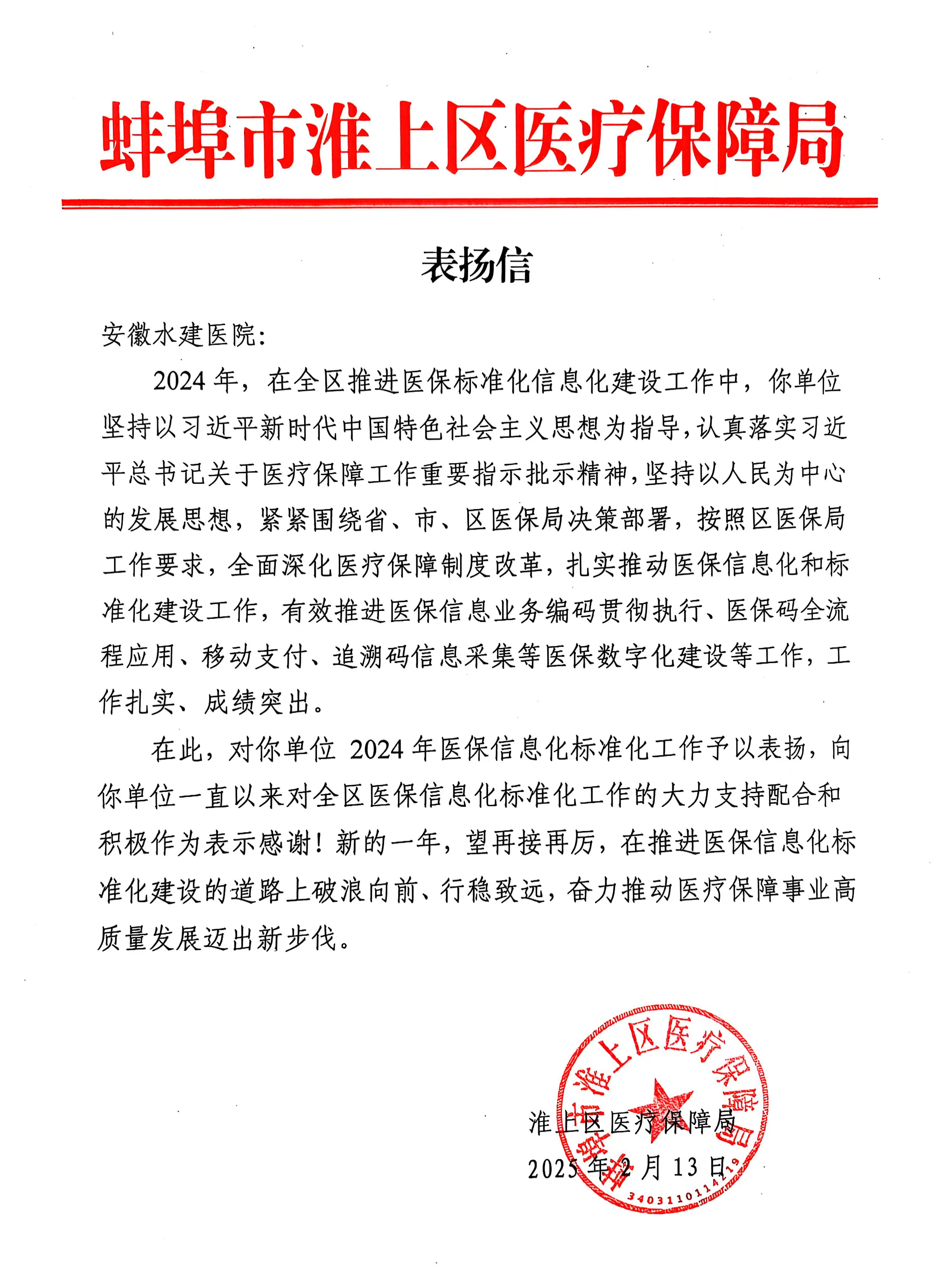 2月13日,安徽建工水建醫院醫保標準化信息化建設獲蚌埠市淮上區醫療保障局表揚。表揚信對醫院認真落實、及時響應省、市、區醫保信息化標準化工作安排部署,在醫保信息業務編碼貫徹執行、醫保碼全流程應用、移動支付、醫保藥品追溯碼信息采集等工作中取得的工作成效給予充分肯定。