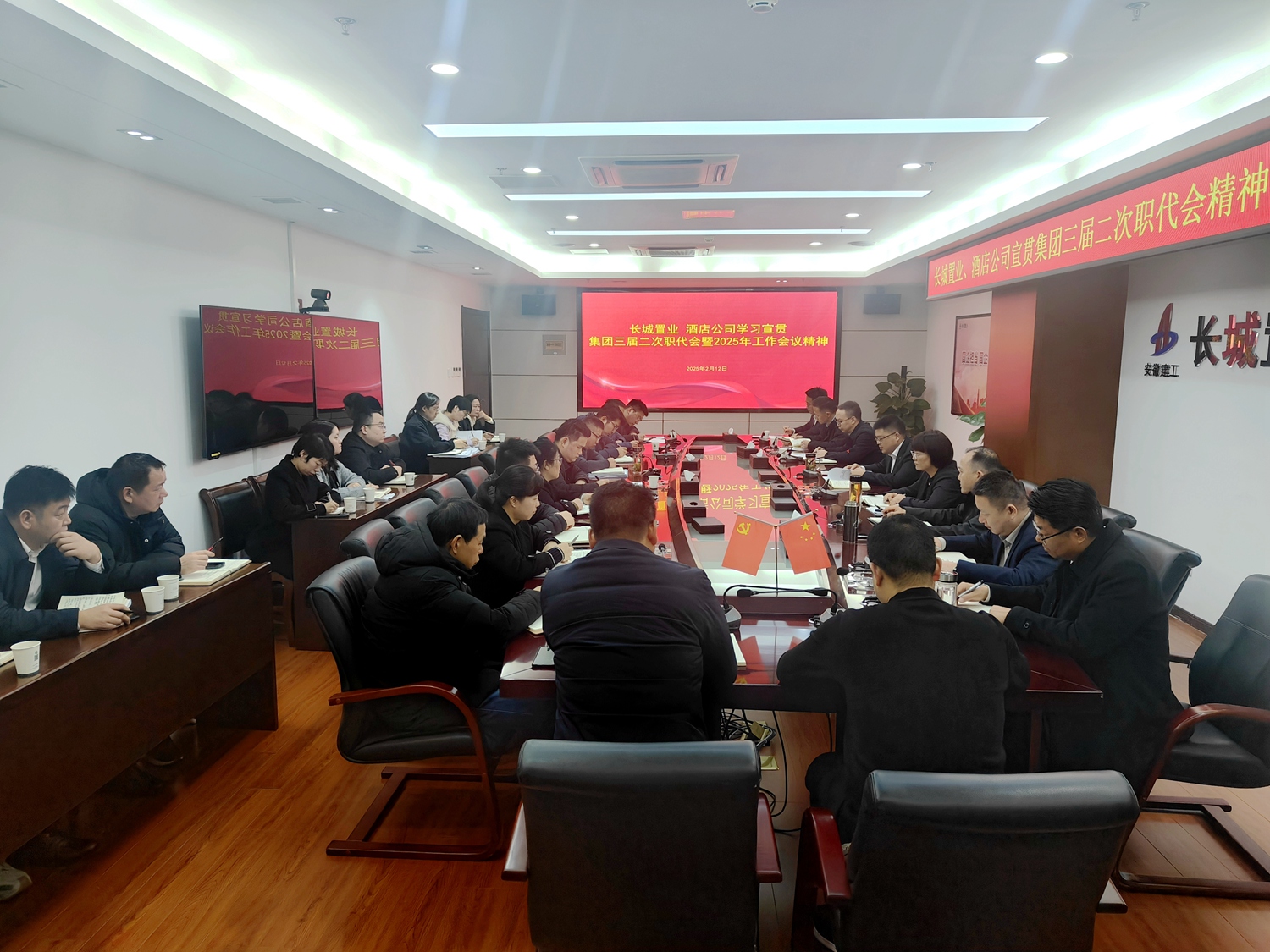 2月12日下午,長城置業、酒店公司第一時間召開黨委(擴大)會議,全面學習宣貫集團三屆二次職代會暨2025年工作會議精神。公司領導班子成員,機關各部門正副職及有關工作組負責同志參加會議。