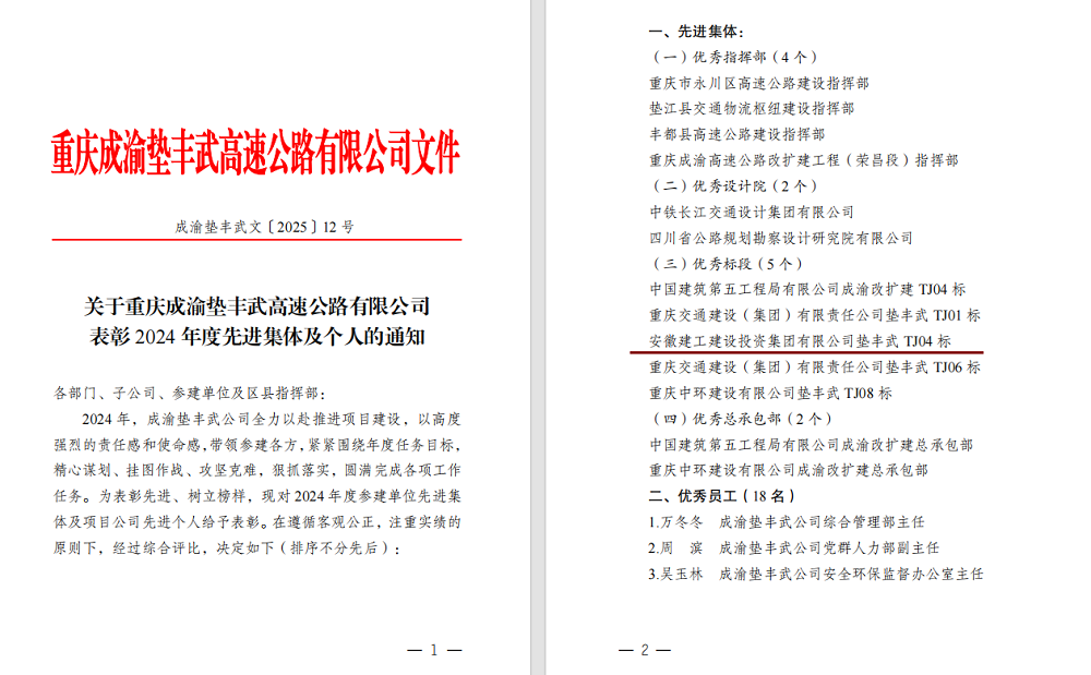 2025年2月17日上午,重慶成渝墊豐武高速公路有限公司組織召開了2025年工作會議。成渝墊豐武高速新建段所有標段、成渝改擴建所有標段以及區縣各指揮部參加會議。安徽建工建設投資集團重慶墊豐武高速公路TJ04標榮獲“2024年度優秀標段”榮譽稱號。