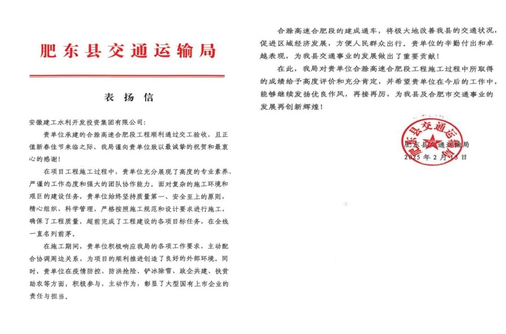 信中指出,合滁高速項目展現(xiàn)出了強大的專業(yè)實力和高效的執(zhí)行能力,在工程質(zhì)量、進度、安全以及文明施工等方面均表現(xiàn)出色,為肥東縣的交通基礎(chǔ)設(shè)施建設(shè)做出了重要貢獻,樹立了行業(yè)標(biāo)桿。