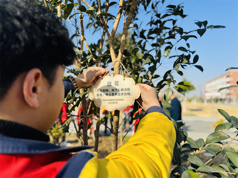 活動現場,副院長呂良玉與同學們一起參加活動并親切交談,希望同學們積極參加植樹活動,一起美化綠化校園,共同建設美麗校園。學生工作處、團委負責人現場演示植樹的具體步驟和要點,在老師的指導下,學生們分組領取鐵鍬與水桶等工具進入場地,有條不紊地揮鍬鏟土、扶苗培土、圍堰澆水,齊心協力種下一棵棵桂花樹苗。種植完成后,各系把帶有寄語的認養牌掛在樹枝上,各系的“護樹”志愿者將持續關注樹木的生長情況,確保每一棵樹苗都能茁壯成長。