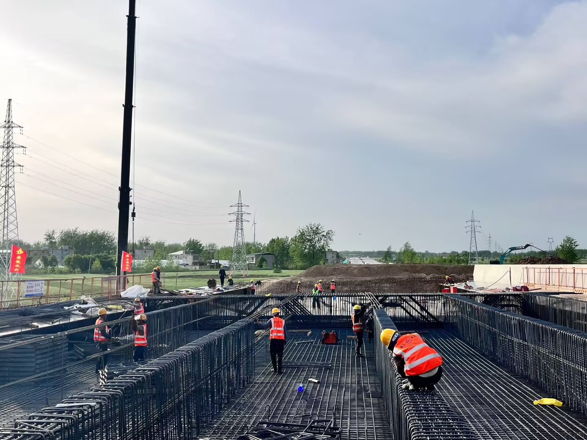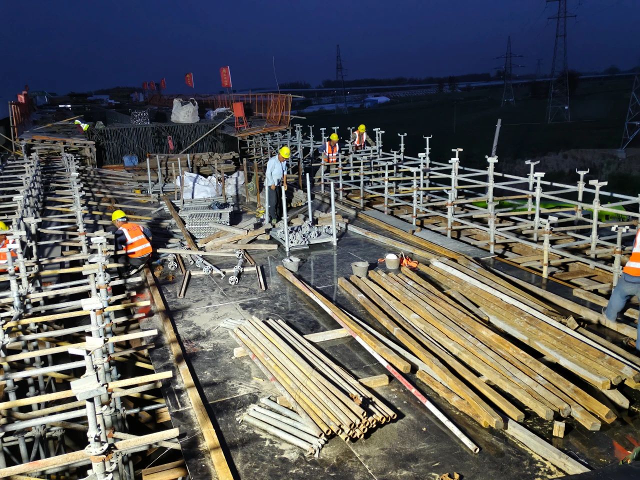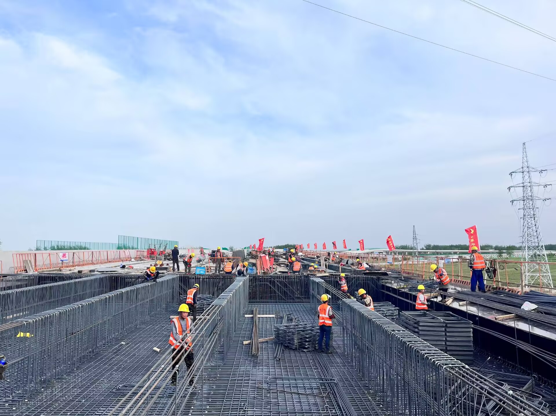 前期由遷改工原因,潁臨高速路基05標公橋樞紐內(nèi)D匝道橋和阜(陽)淮(濱)分離立交橋的一聯(lián)二跨連續(xù)箱梁現(xiàn)澆、一聯(lián)四跨連續(xù)箱梁現(xiàn)澆、一跨25米預制箱梁安裝(均包括樁基和下部結(jié)構(gòu))未能開工。在經(jīng)過項目多次積極主動聯(lián)系業(yè)主單位及遷改單位,積極配合遷改施工情況下,2025年3月1日影響項目全線貫通的35KV高壓桿線順利拆除完成。項目隨后立即組織編排施工計劃,倒排工期,合理配置人材機,迅速啟動樁基施工,過程中加強管理及時調(diào)整施工計劃,增加人員設備投入,經(jīng)過近一個半月的日夜奮斗,目前樁基下部及梁板安裝已完成,現(xiàn)場施工體系已迅速完成轉(zhuǎn)換,進入橋面系及現(xiàn)澆箱梁施工階段,經(jīng)過與地方交通局及各級主管單位的溝通協(xié)調(diào),項目及時解決D匝道橋現(xiàn)澆段跨318省道門洞搭設及省道兩側(cè)限高通行交通管制問題,確保施工任務能按時完成。