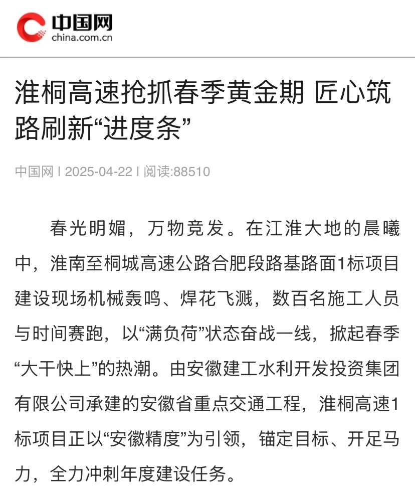 【中國網、大皖新聞】建工水利淮桐高速搶抓春季黃金期 匠心筑路刷新“進度條”