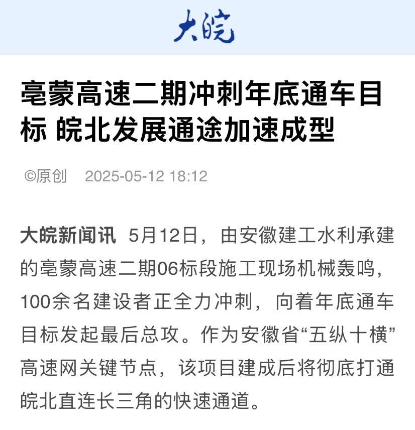 亳蒙高速全長約92.6公里,是安徽省“五縱十橫”高速網的重要組成干線,目前,該項目已完成總工程量92%。項目建成后,亳州至蒙城車程將縮短至1小時內,進一步促進皖北地區產業聯動與旅游資源共享,助力鄉村振興與經濟高質量發展。