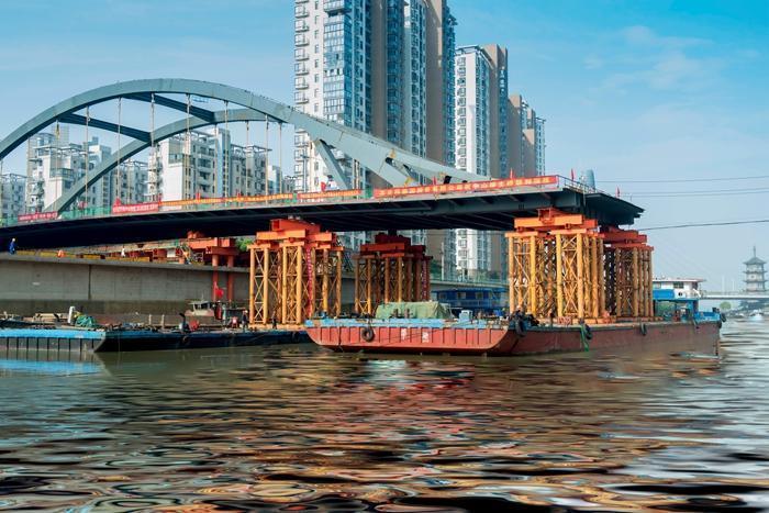 蕪湖中山橋是橫跨青弋江的地標性建筑,連接鏡湖區與弋江區,集商貿、旅游、交通功能于一體,因與中山路相連,承載紀念孫中山先生的歷史意義,亦是蕪湖 “半城山半城水” 城市風貌的典型象征。橋梁全長352.9米,主橋為(28+90+28)米系桿鋼結構拱橋。建設中首創通航水域雙躉船交替沉浮支撐體系,研發大跨度鋼箱拱橋整體頂推及雙船轉換支撐浮推技術,僅用24小時便完成水上浮船頂推作業,在保障河道通航的同時,實現了鋼結構橋梁的高效整體安裝,成為城市內河通航條件下橋梁水上施工的典范。