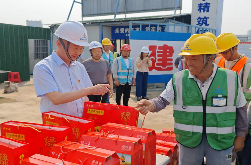 一線送暖,工地粽香話發展。楊金龍一行抵達施工現場,為奮戰在一線的工人送上粽子、咸鴨蛋、綠豆糕等端午慰問品,向他們致以節日的問候和誠摯的感謝,并叮囑大家在高溫天氣下要注意防暑降溫,確保安全生產。同時,楊金龍圍繞項目建設進度、質量管控、安全生產等方面開展實地調研,與項目負責人深入探討并提出指導性意見。