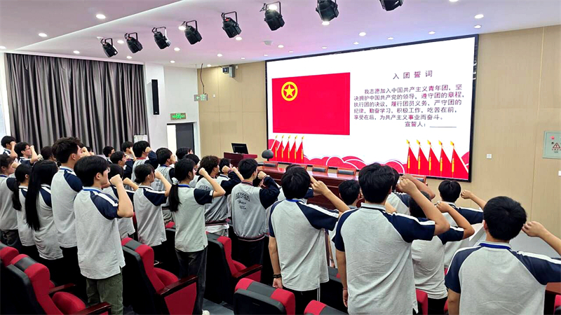 儀式在莊嚴的國歌聲中拉開帷幕。全體師生肅立,齊唱國歌,表達了對祖國的熱愛與崇敬之情。隨后,陳淼老師宣讀了新團員名單,新團員上臺領取團員證和團徽,全體新團員在團委委員程蓉的帶領下,面向團旗莊嚴宣誓,鏗鏘誓言響徹禮堂,彰顯著新時代青年的蓬勃朝氣。新團員代表在發言中表達了對團組織的向往和加入共青團的自豪之情,表示將以更高的標準要求自己,努力學習科學文化知識,積極參與團組織的各項活動,為共青團事業貢獻自己的力量。