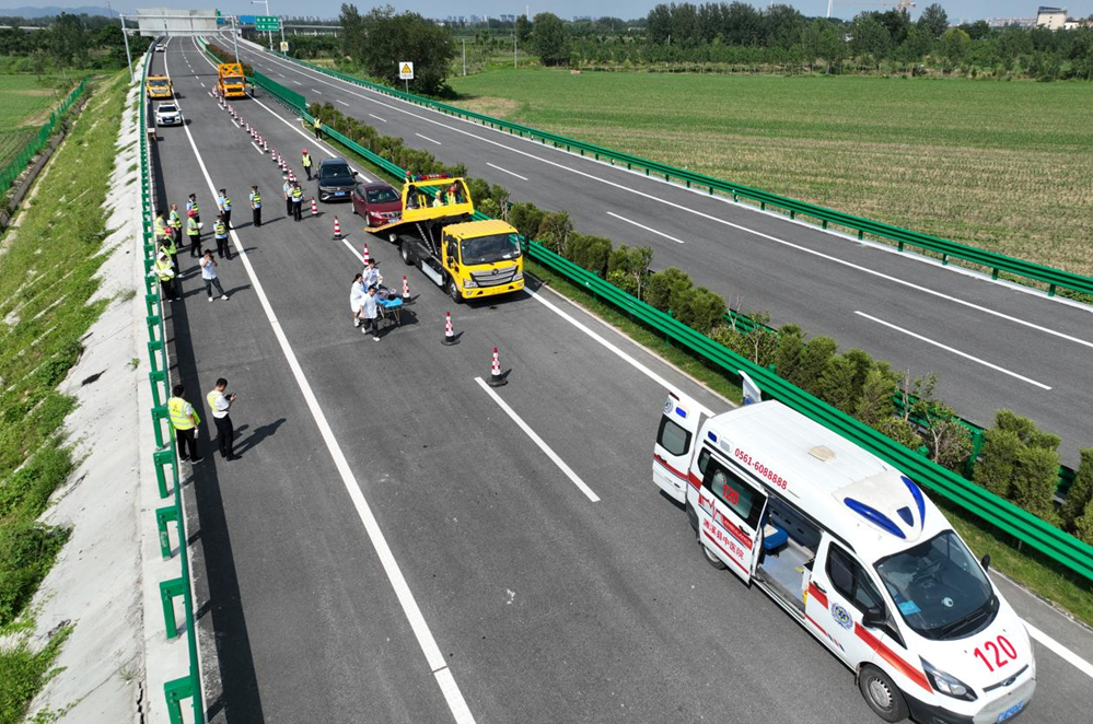 6 月 30 日下午,建工投資徐淮阜高速公路聯合高速交警、路政、衛健委等多部門開展交通事故應急處置實戰演練。