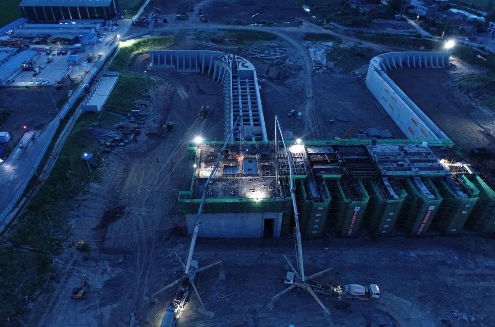 6日上午10時30分正式開倉,項目部投入2臺汽車泵、16輛攪拌車及50余名施工人員。為確保高溫下混凝土施工質(zhì)量,項目部采取預(yù)埋冷卻水管、加冰降溫、灑水養(yǎng)護等技術(shù)措施,嚴(yán)控混凝土溫度;各班組輪番作業(yè)、緊密配合,克服高溫不利影響,最終圓滿完成澆筑任務(wù),為工程整體推進提供了有力保障。