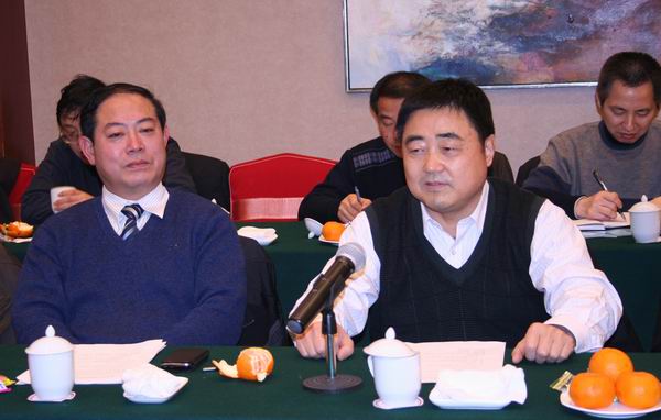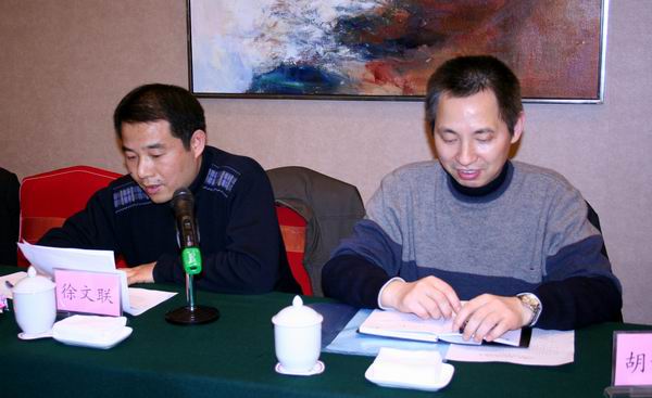 建工集團董事會秘書徐文聯(左)和辦公室副主任胡六中(右)分別宣讀《先進辦公室、優秀辦公室主任評選辦法》和《辦公室主任聯席會議制度》征求意見稿