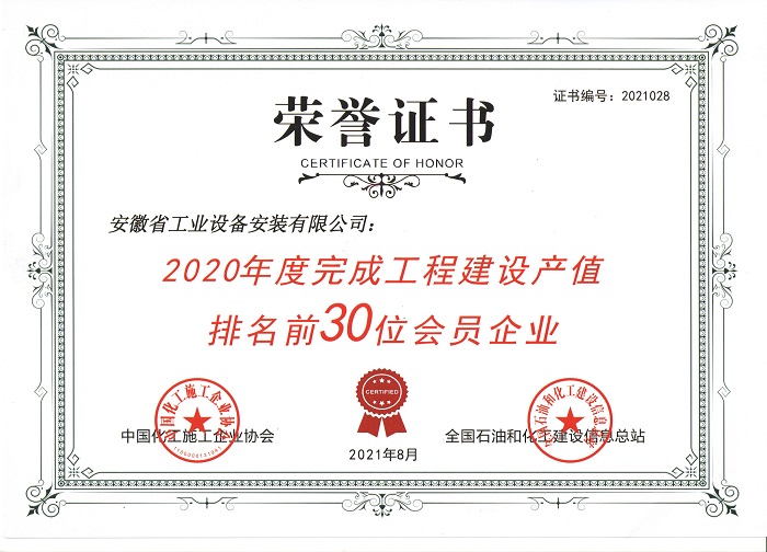 Most recently, China National Association of Chemical Construction Enterprises and National Petroleum and Chemical Construction Information Master Station jointly announced the List of Top 30 Members of Chemical Engineering Construction in 2020, ACEG Industrial Equipment Installation Co., Ltd. - one of ACEG’s subsidiaries, professional contractor for industrial equipment installing and workshop building engineering and construction, has been ranked among the top 30 enterprises in terms of their annual output values in 2020.