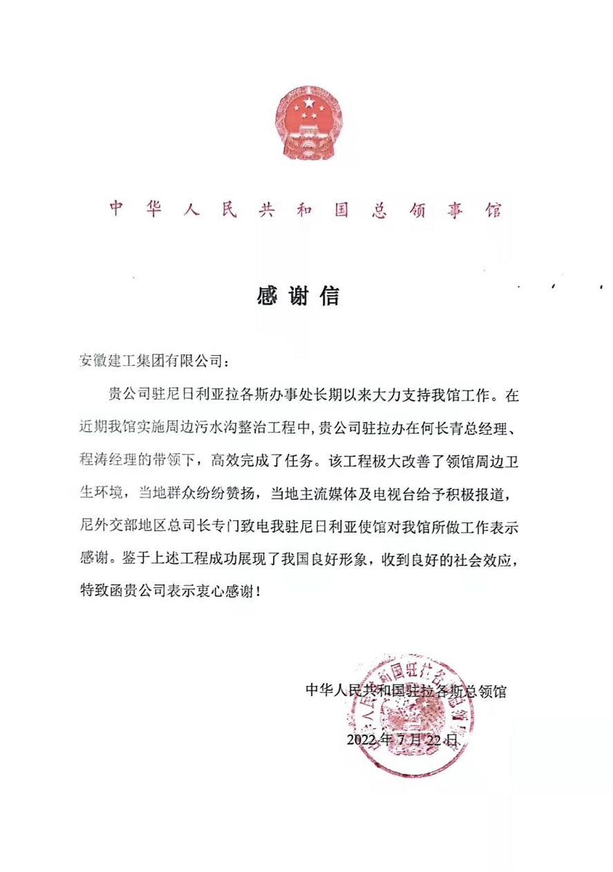 Anhui Construction Engineering Group received a letter of thanks from the Chinese Consulate-General in Lagos, Nigeria, on July 22, expressing its thanks to the Anhui Construction Engineering Group Office in Lagos, Nigeria, for the high quality and efficient completion of the environment renovation works of Idejo Street drainage channels outside the compound of the Consulate General.