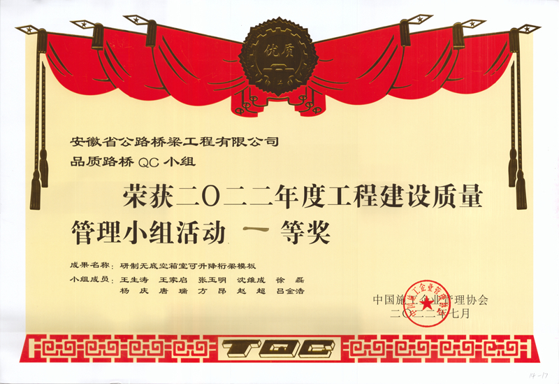 Recently, the 2022 Construction Quality Management Team Competition Activities sponsored by China Association of Construction Enterprise Management (CACEM) was successfully concluded in Boao, Hainan province, ACEG Road and Bridge Company’s Quality-Control achievement - the Development of Liftable Truss Formworks with Bottomless Empty Chamber stood out from more than the 1,600 achievements collected for this event nationwide and won the first prize for its detailed and rigorous contents, novel and unique conception and remarkable practical values, and was unanimously praised by the experts of the evaluation committee of the association.